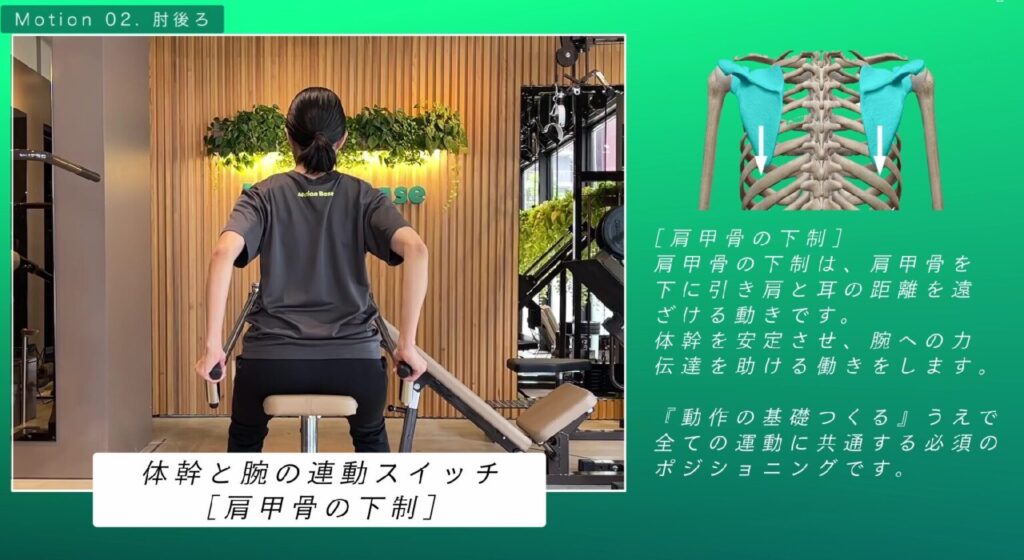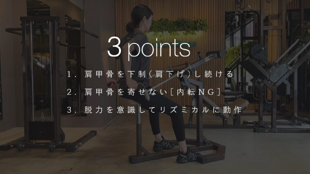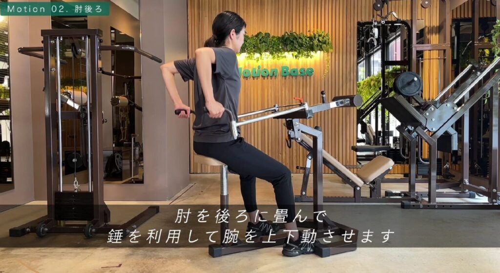 グリップを真上から握り、肘をおおよそ90度に曲げた位置で、肩の力を抜きながらグリップを上下させるように動かします。お辞儀をするように、上半身を軽く前方へ倒すと、より動かしやすいです。