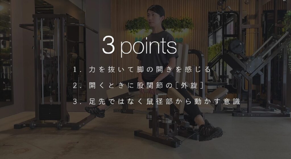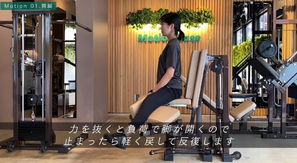 両脚に軽く力を入れて、パッドを閉じます。その後その力を緩めると、パッドが開きます。その際、内ももにストレッチ感が得られます。ストレッチ感を得られたら、再度パッドを閉じるように力を入れます。一連の動作を繰り返します。