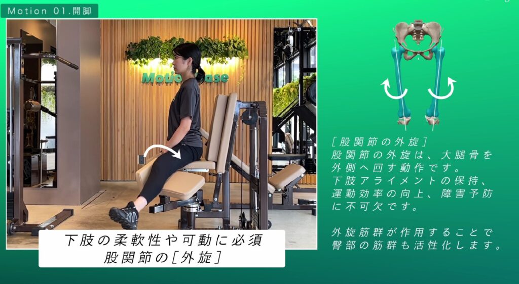 より上達すると開脚動作時に、外側にねじられる感覚が得られます。