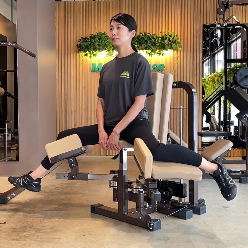 座面付近のレバーを手前に動かすことで、座面の高さを変えられます。開脚動作が苦手の場合は、やや高めにして、左右のパッドの角度をつけた位置に設定をします。パッドの幅はご自身の脚が載せやすい幅に設置をします。その際、片脚はまっすぐにしてパッドに載せ、反対側の脚は内側にひねり、膝を90度程度に曲げてパッドに載せます。内側に捻るのが苦手な場合は、パッドの角度をより急に設定します。