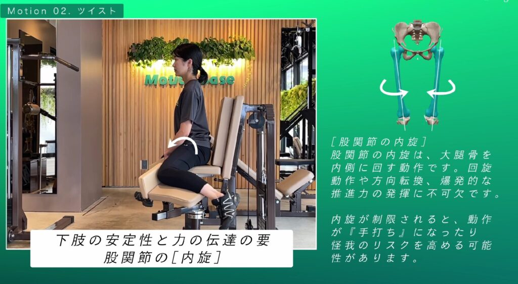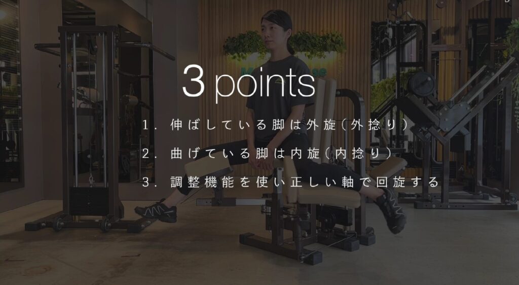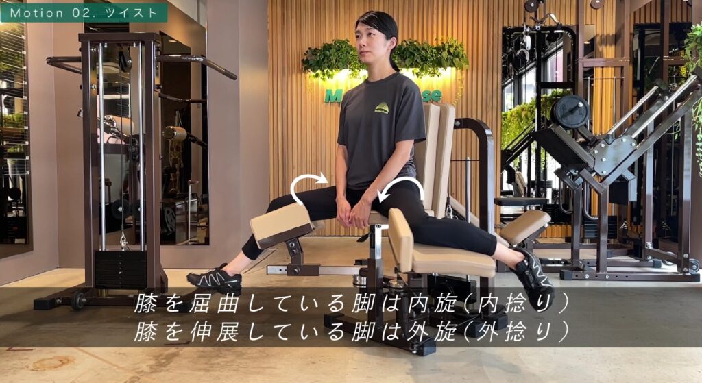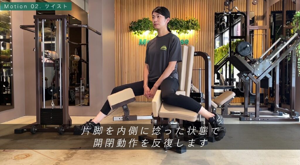 両脚に軽く力を入れて、パッドを閉じます。その後その力を緩めると、パッドが開きます。まっすぐに伸ばした側の脚は内ももに、内側に捻った側の脚は前ももにストレッチ感が得られます。ストレッチ感を得られたら、再度パッドを閉じるように力を入れます。一連の動作を繰り返します。