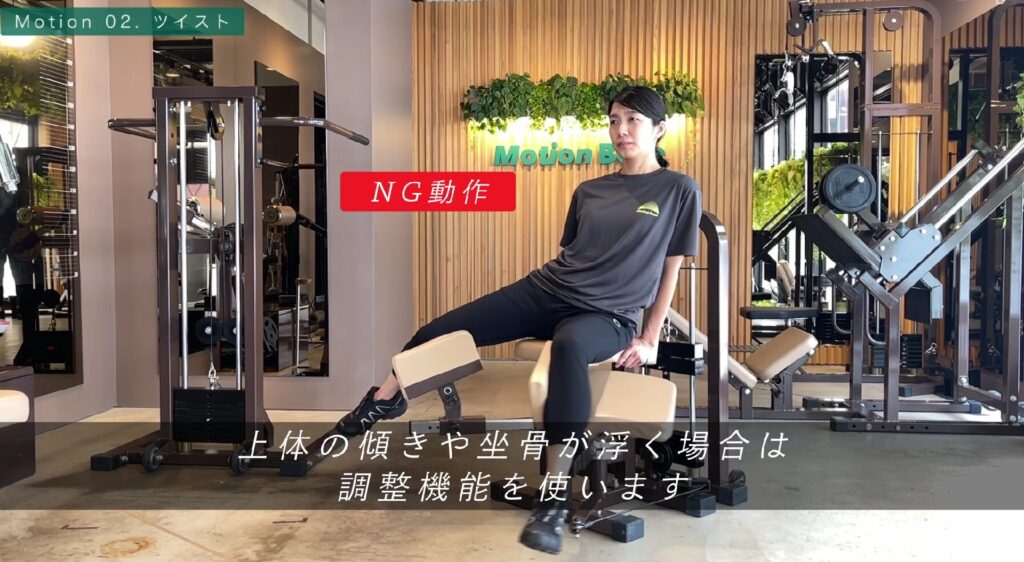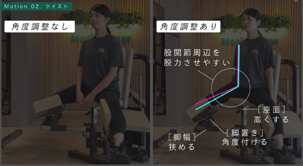 座面付近のレバーを手前に動かすことで、座面の高さを変えられます。開脚動作が苦手の場合は、やや高めにして、左右のパッドの角度をつけた位置に設定をします。パッドの幅はご自身の脚が載せやすい幅に設置をします。その際、片脚はまっすぐにしてパッドに載せ、反対側の脚は内側にひねり、膝を90度程度に曲げてパッドに載せます。内側に捻るのが苦手な場合は、パッドの角度をより急に設定します。