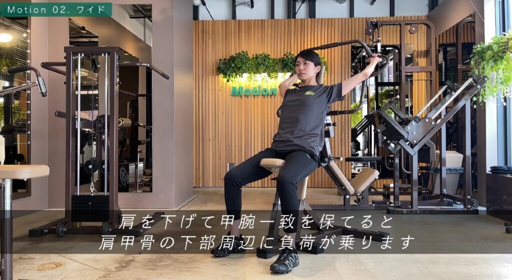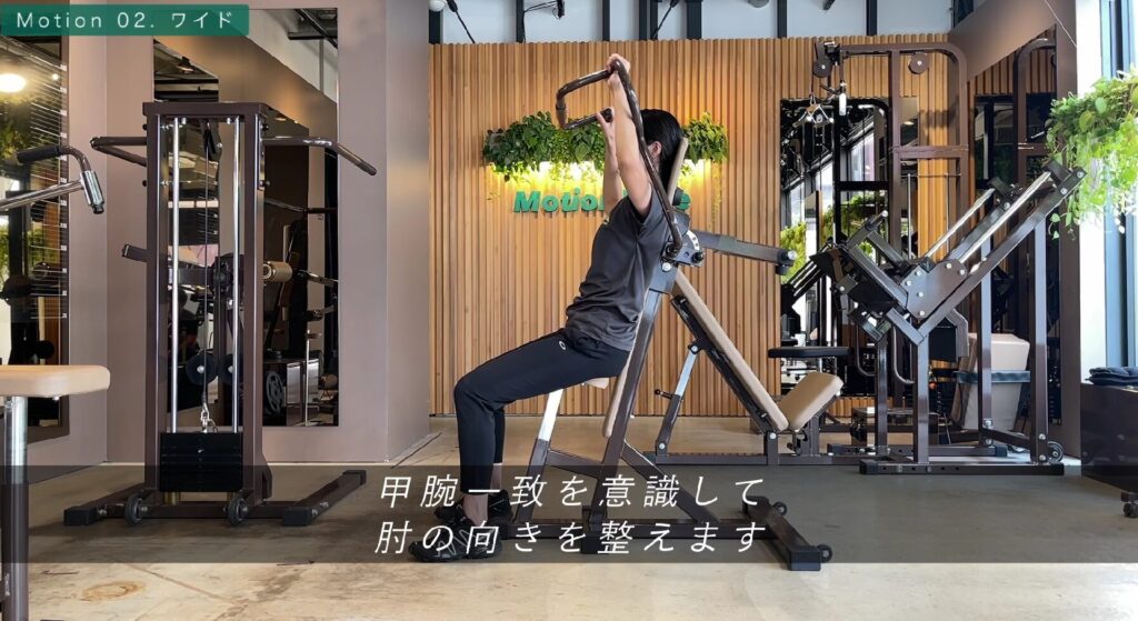 バー両端部を握り、バンザイをするような姿勢を取ります。そのまま軽く前方へバーを引っ張ります。引っ張った力を脱力をすると後方にバーが倒れ込み、胸部にストレッチ感を与えます。これを感じたら、バーを前方へ引っ張ります。