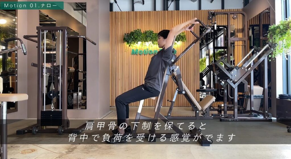 やや前方へバーを引いたら、その力を抜くと後方へバーを握った腕が引っ張られます。背部や脇の筋肉が伸びる感覚を得たら、軽くバーを戻します。