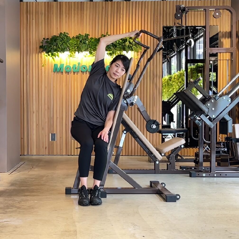 そのまま、バーのやや前方が張り出している部分を握り、引っ張ります。引っ張った力を緩めると、腕が斜め情報に引っ張られます。その際引っ張られた側の体側部分にストレッチ感が得られます。ストレッチ感が得られたら、再度バーを引っ張ります。この一連の流れを繰り返します。