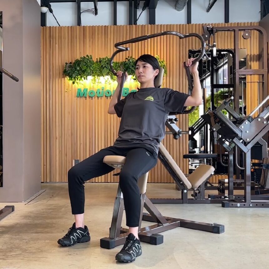 マシンの背もたれに、動かしたい側と反対側の肩が当たるように座ります(例:右腕を動かしたい場合は、左肩が背もたれに当たるように座ります)。